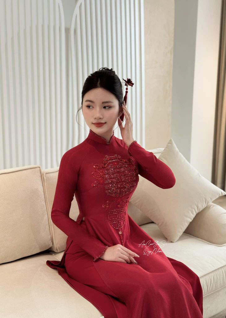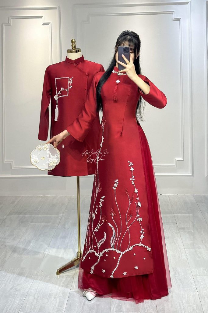 Với thiết kế cổ cao, tay dài, chất liệu lụa trơn hoặc lụa thêu họa tiết, mẫu áo dài truyền thống vẫn được nhiều cô dâu Quy Nhơn lựa chọn trong lễ gia tiên hoặc lễ rước dâu. Màu sắc thường là đỏ hoặc trắng, kèm theo mấn đội đầu và khăn đóng cho chú rể, tạo nên sự đồng bộ và tôn nghi lễ cổ truyền.